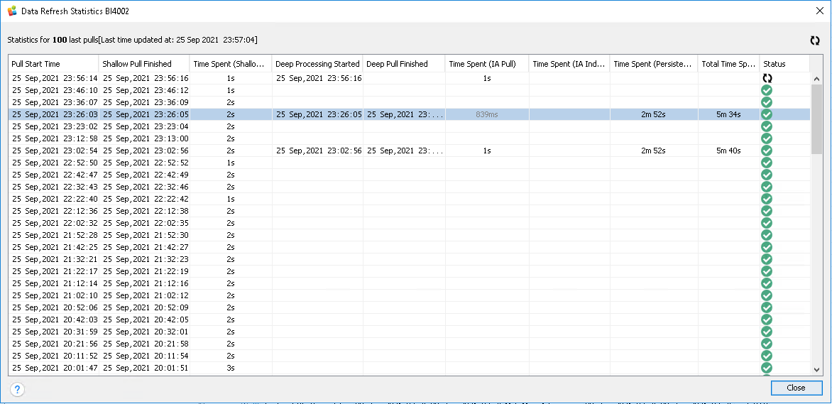 You can monitor progress of the current shallow and deep pull commands and also view the log of all previous pulls in the Data Refresh Statistics dialog window:
